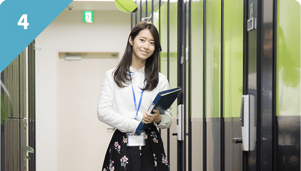お仕事が決まったら、派遣先企業での就業がスタート!終業後も悩みや問題を気軽に相談できるよう、営業担当が定期的にあなたの職場へ伺います。